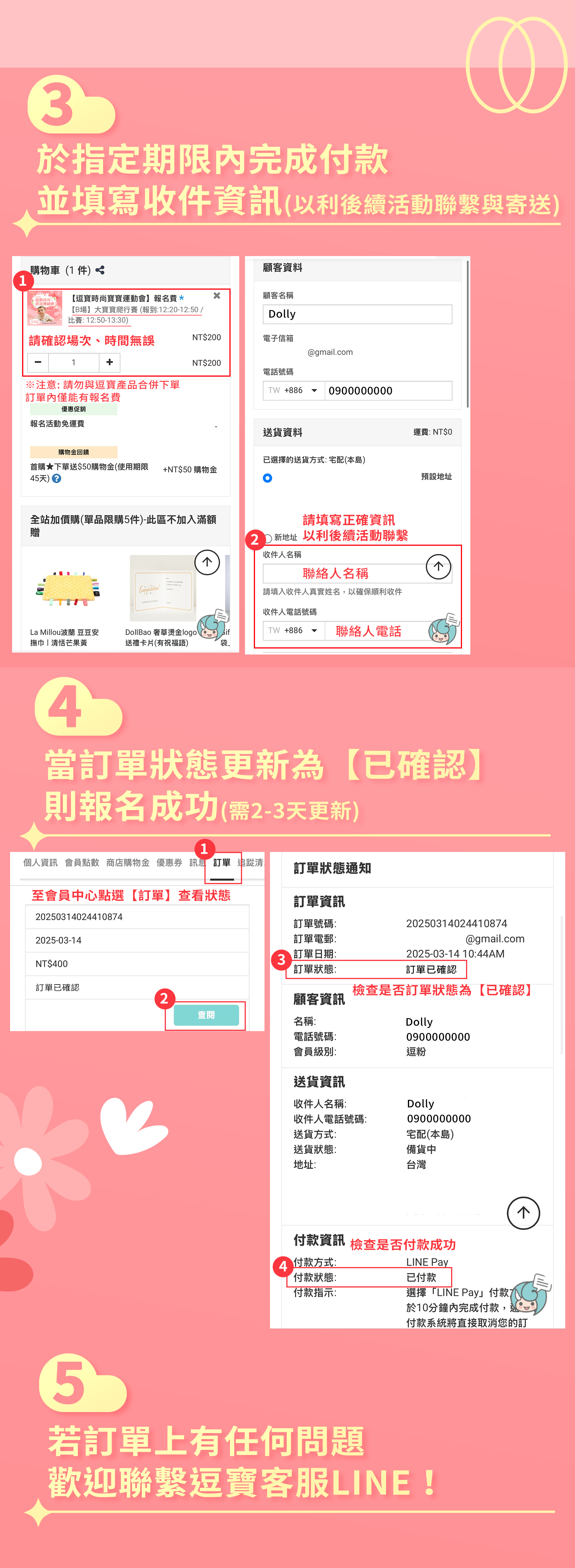 步驟3: 於指定期限內完成付款 (結帳頁面務必填寫收件資訊,以利後續活動聯繫)