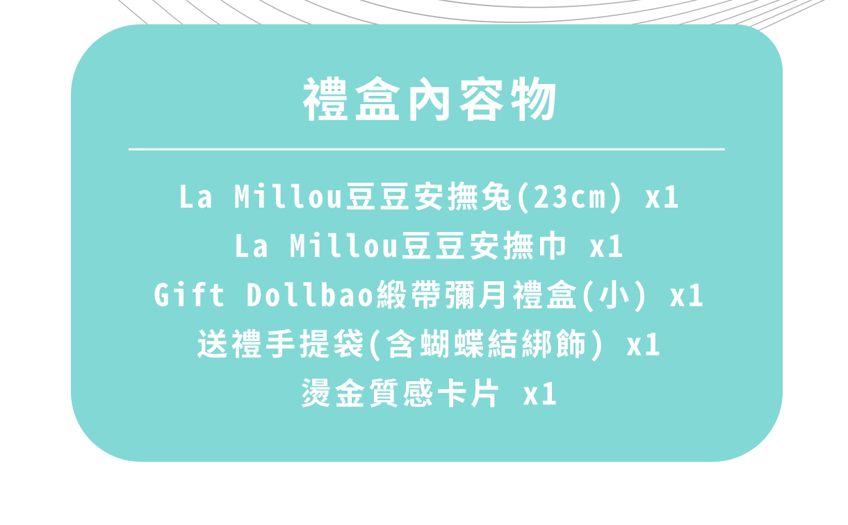 此套組含豆豆安撫兔23cm x1+豆豆安撫巾 x1+緞帶彌月禮盒 x1+送禮手提袋(含蝴蝶結綁飾) x1+燙金質感卡片 x1