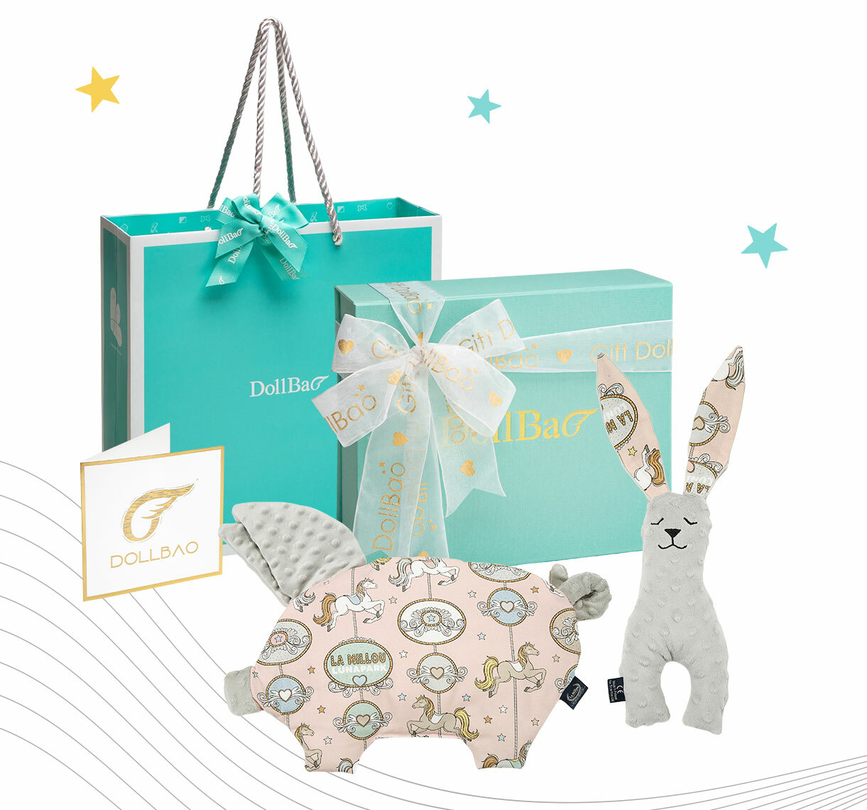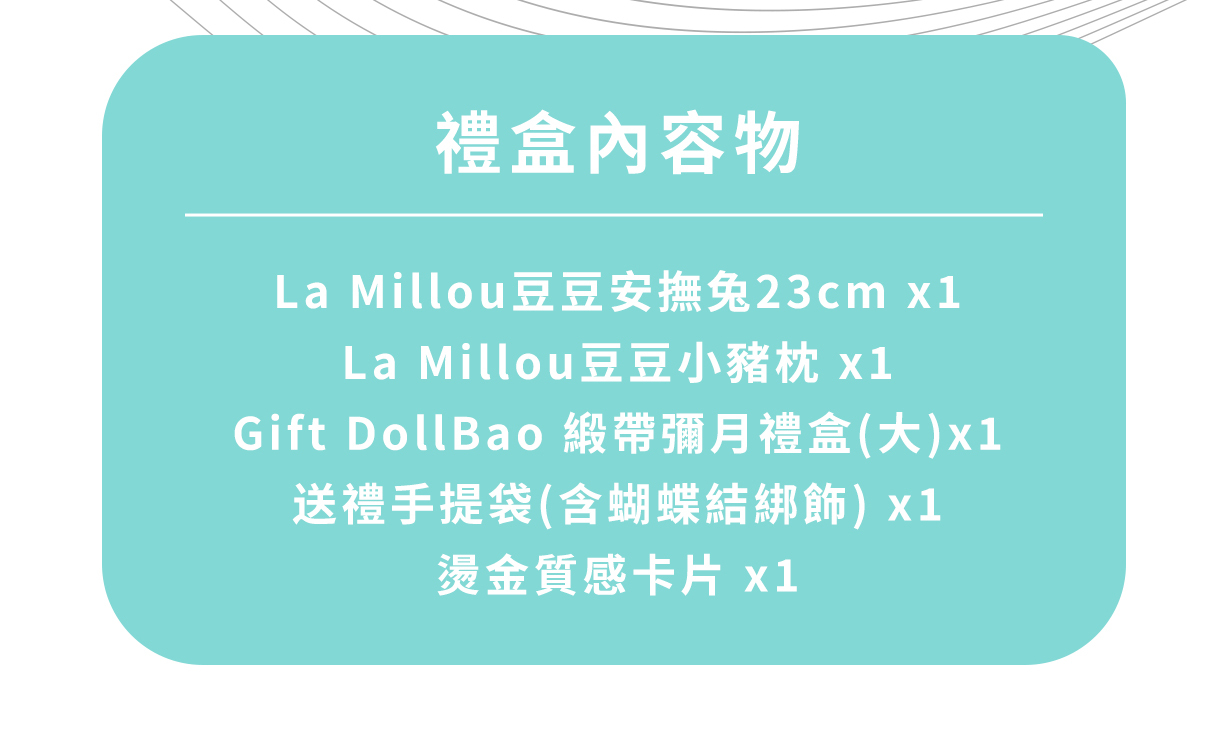此套組含豆豆安撫兔23cm x1+小豬枕 x1+緞帶彌月禮盒 x1+送禮手提袋(含蝴蝶結綁飾) x1+燙金質感卡片 x1