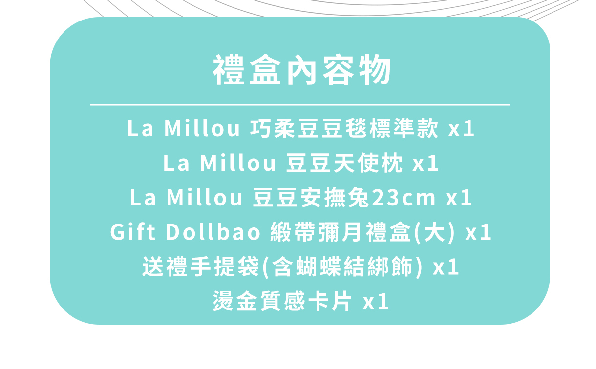 此套組含巧柔豆豆毯標準款 x2+豆豆小豬枕 x1+天使枕x1+緞帶彌月禮盒 x1+送禮手提袋(含蝴蝶結綁飾) x1+燙金質感卡片 x1