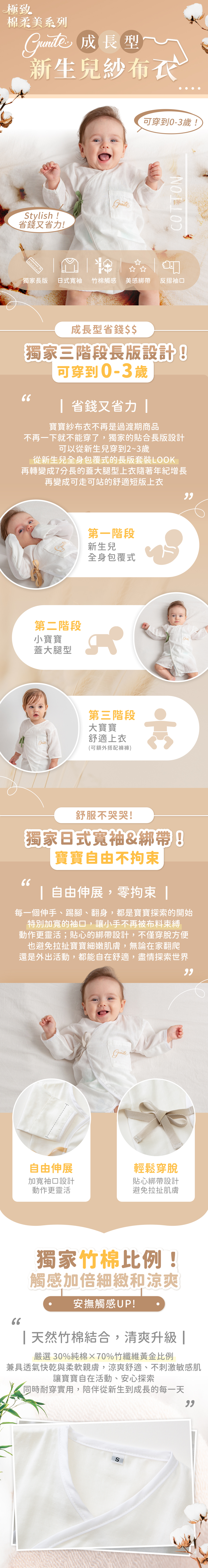gunite極致棉柔美系列-成長型新生兒紗布衣|S-M號(3M~3Y ) |綠帶白
