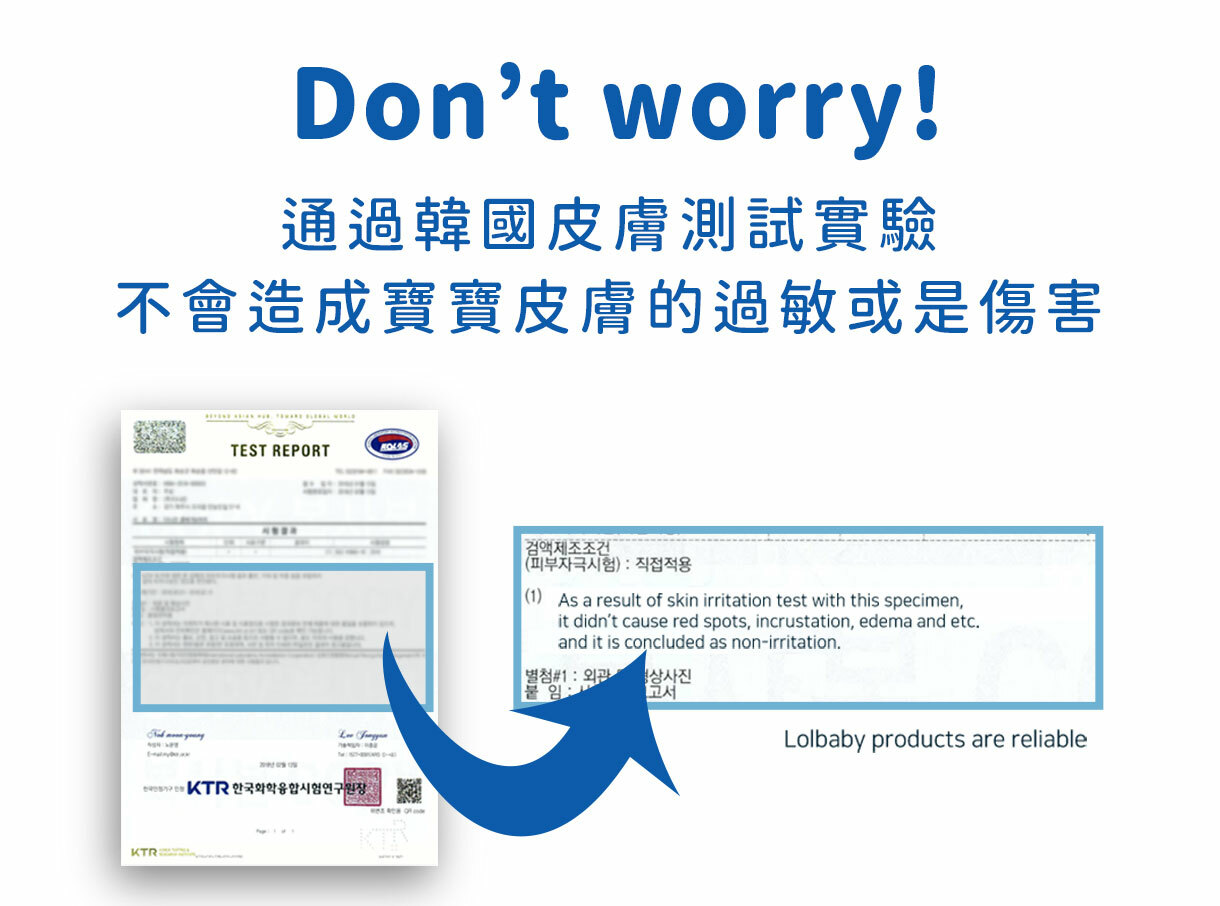 通過多次皮膚試驗並獲得認證,絕對不會對寶寶皮膚造成負擔,或是過敏、受傷的狀況,可以安心使用!