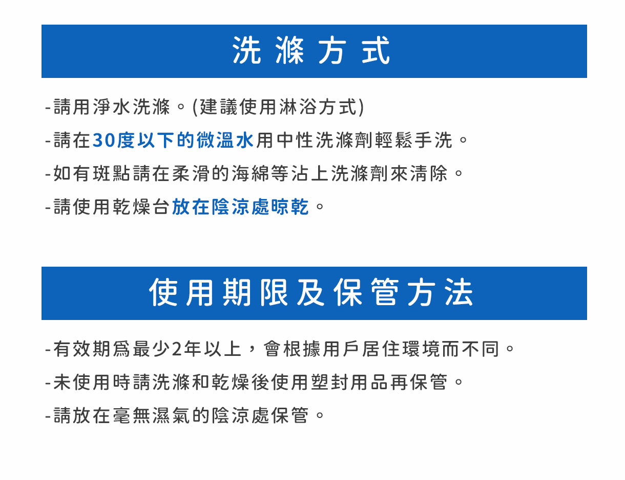 清洗方式:請用30度以下之微溫水,搭配中性洗衣劑手洗後(建議使用淋浴方式),放置在乾燥檯面陰乾,避免直射太陽。若有斑點出現,可用柔軟海綿搭配中性洗衣劑來清除。請勿使用洗衣機清洗,且不可烘乾。