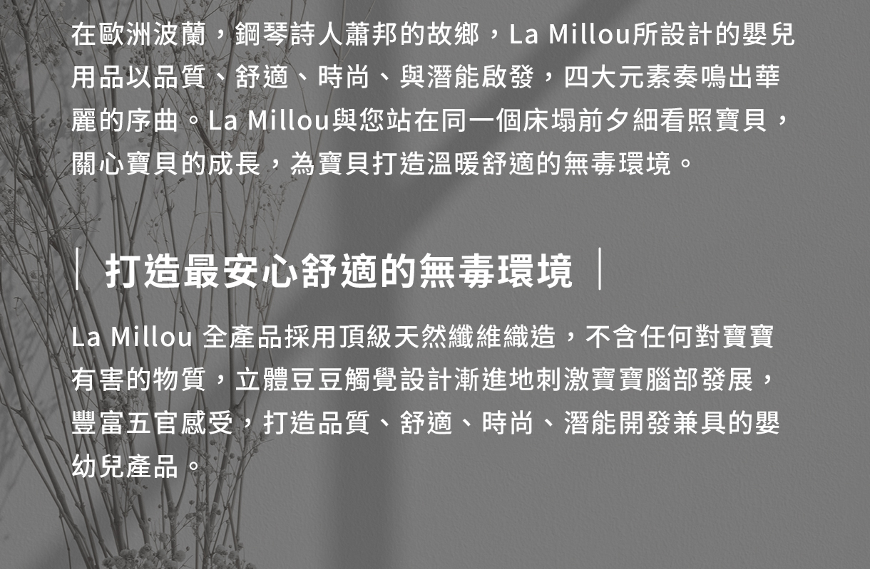 La Millou自2010年創立至今,已連續獲得國內外多項獎項,包括知名的Institute of Mother and Child、The Mam Dzieco Super product Award、mombaby媽媽寶寶,好評蟬連十年,重視美感、設計感、觸感的媽咪,寶貝們絕不容錯過。