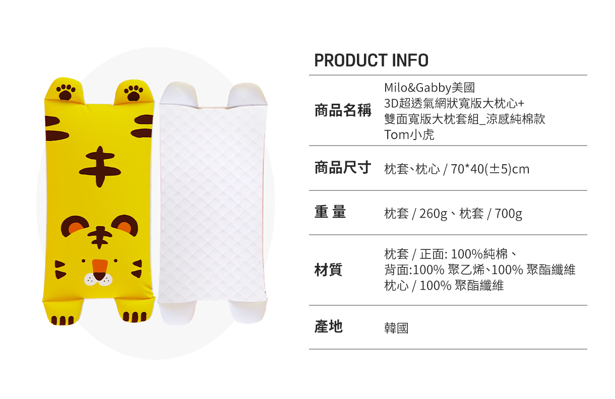 Milo&Gabby美國 3D超透氣網狀寬版大枕心+雙面寬版大枕套組_涼感純棉款|Tom小虎
