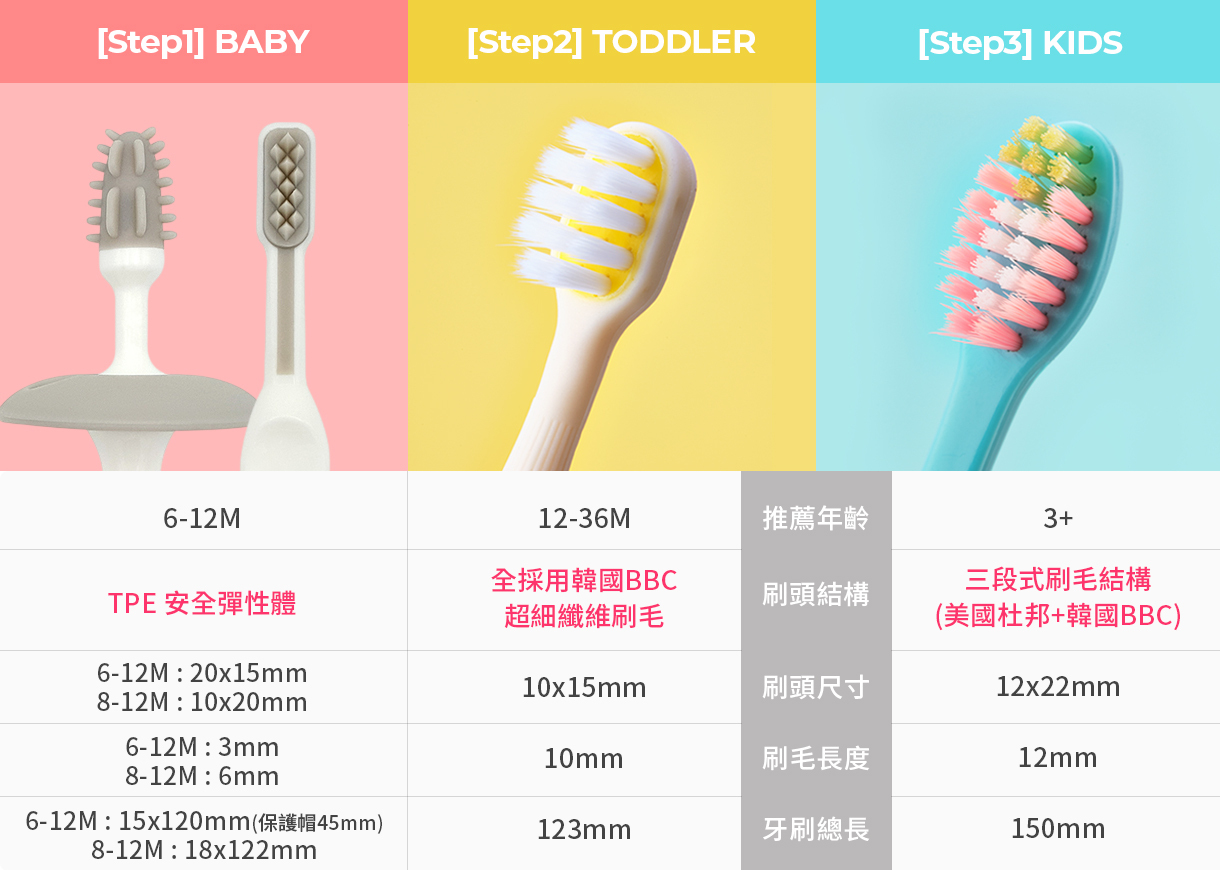 A1:3 歲後飲食變複雜,且乳牙每一顆都長的不同,需要更強的清潔力。前(綠)與中(白)的杜邦刷毛負責刷除頑固牙垢,BBC 細毛負責深入牙縫並保護牙齦,兩者結合才能達到「乾淨又不傷牙」的最佳平衡。